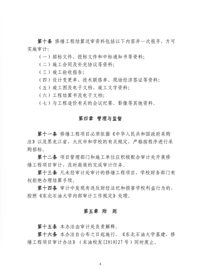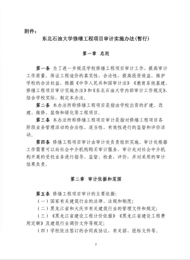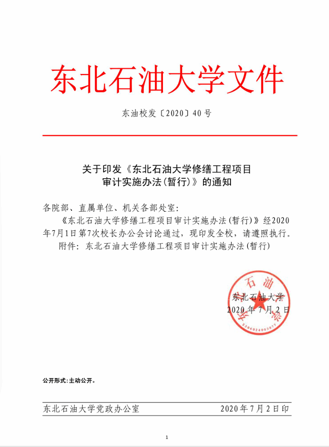 关于印发《东北石油大学修缮工程项目审计实施办法(暂行)》的通知